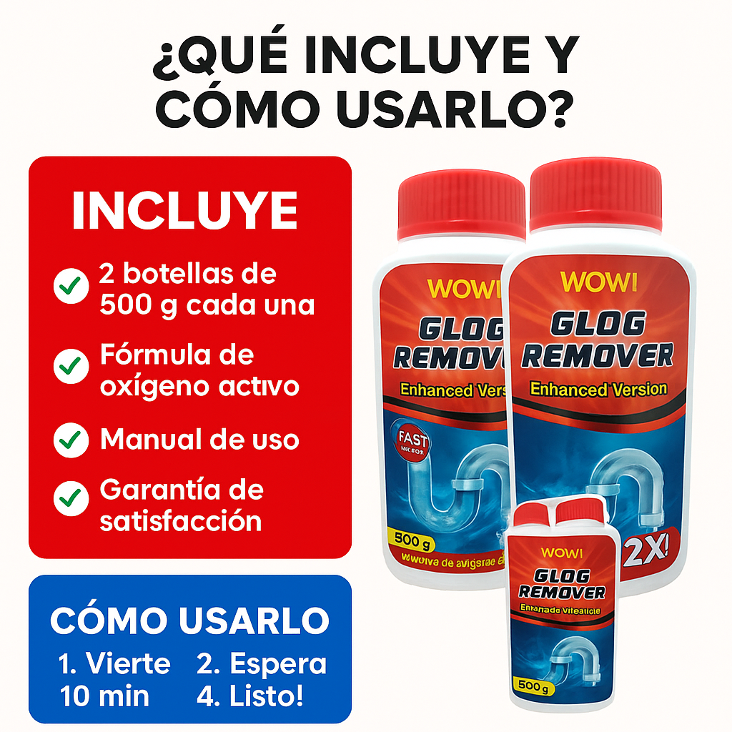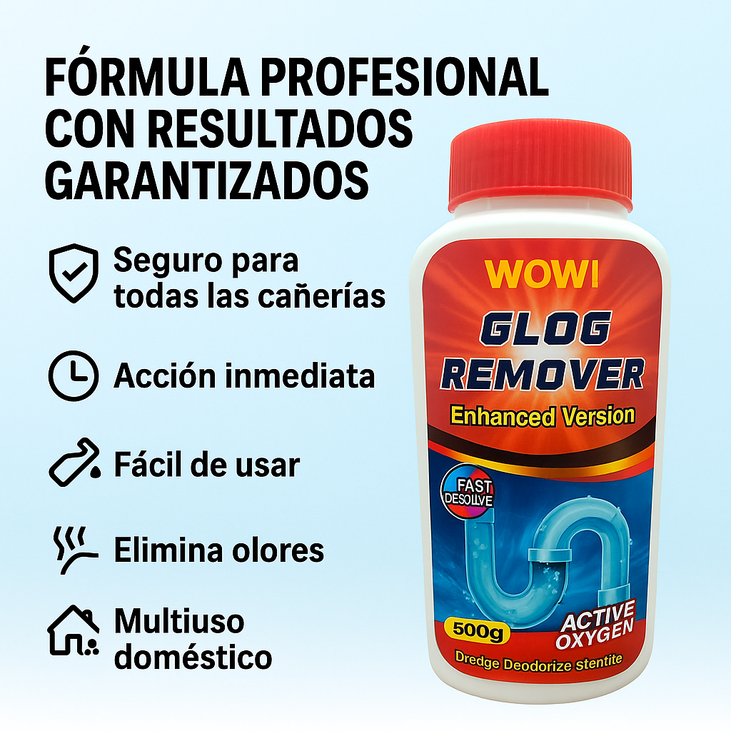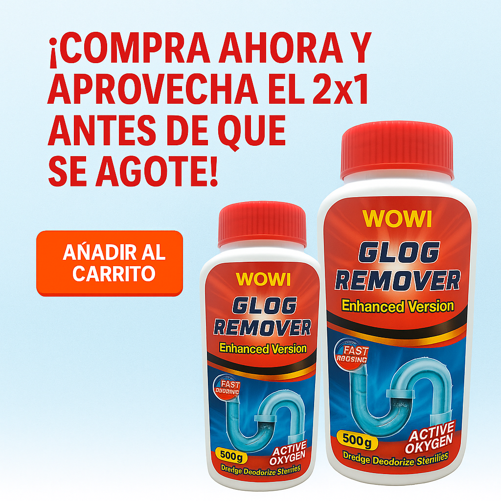 Glog Remover está diseñado para ofrecer resultados profesionales en casa. Su fórmula en polvo con oxígeno activo reacciona al contacto con el agua, creando un efecto efervescente que disuelve incluso los bloqueos más difíciles sin necesidad de herramientas. Con la promo 2×1, tendrás producto suficiente para mantener tu hogar libre de obstrucciones durante meses.